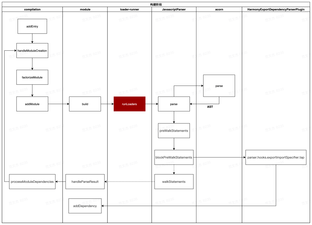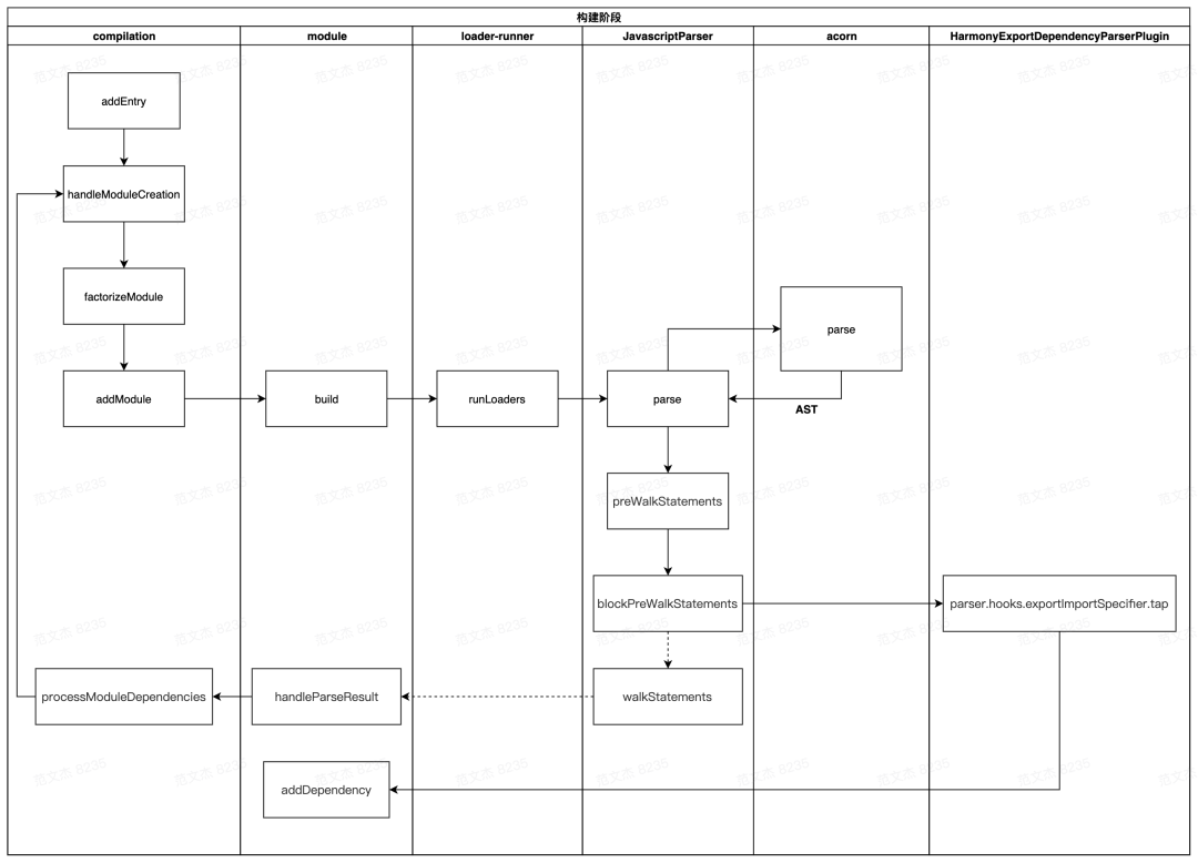 这些问题,基本上在构建阶段都能看出一些端倪。构建阶段从 entry 开始递归解析资源与资源的依赖,在 compilation 对象内逐步构建出 module 集合以及 module 之间的依赖关系,核心流程: