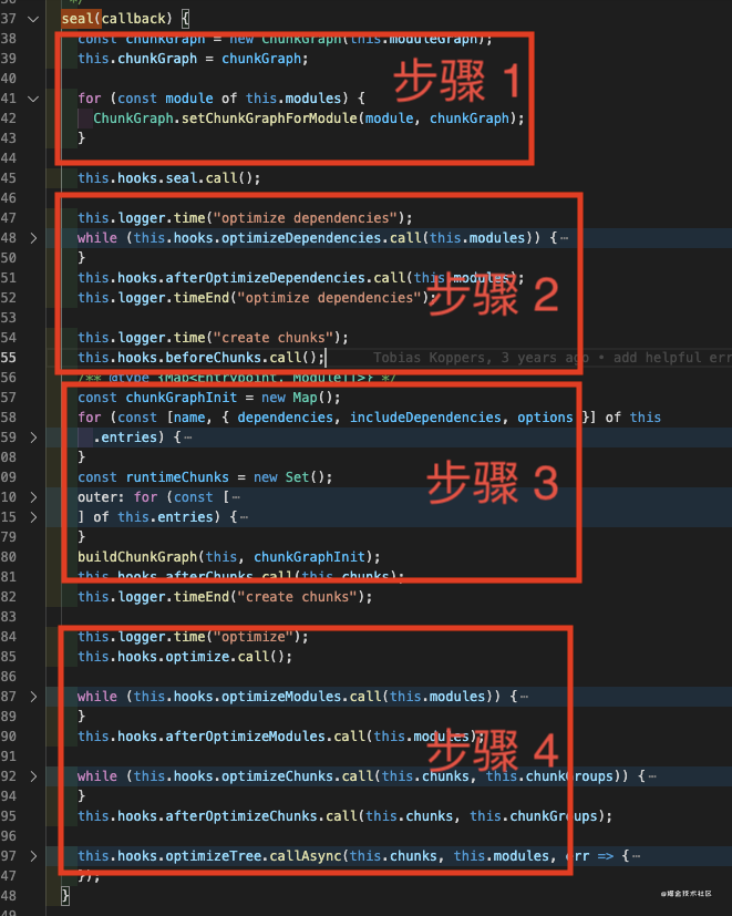 回顾 compilation.seal 函数的代码,大致上可以梳理成这么 4 个步骤: