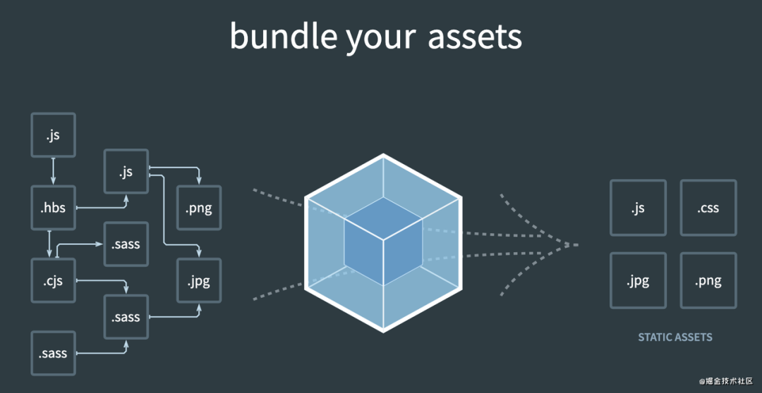 也就是将各种类型的资源,包括图片、css、js 等,转译、组合、拼接、生成 JS 格式的 bundler 文件。官网首页的动画很形象地表达了这一点: