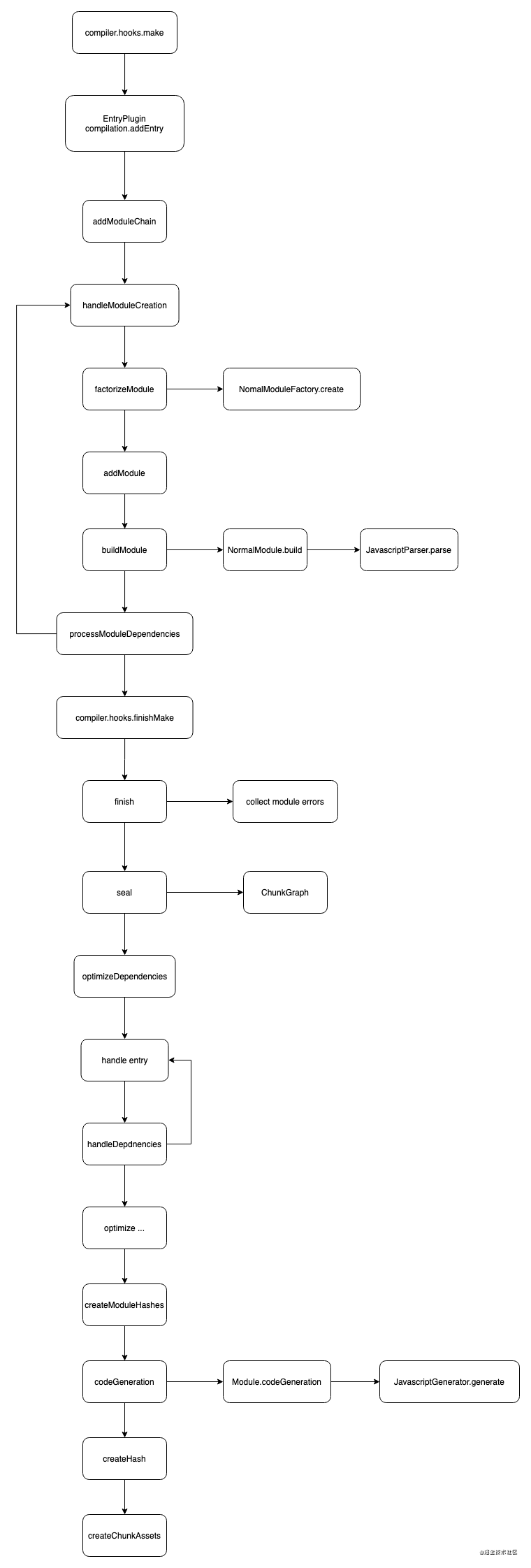 EntryPlugin的make回调,在回调中执行compilation.addEntry函数compilation.addEntry函数内部经过一坨与主流程无关的hook之后,再调用handleModuleCreate函数,正式开始构建内容