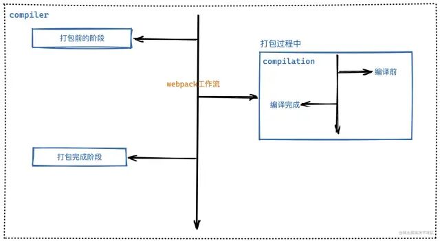 在 Webpack 源码中,compiler 就像是一个大管家,它就代表上面说的三个阶段,在它上面挂载着各种生命周期函数,而 compilation 就像专管伙食的厨师,专门负责编译相关的工作,也就是打包过程中这个阶段。画个图帮助大家理解: