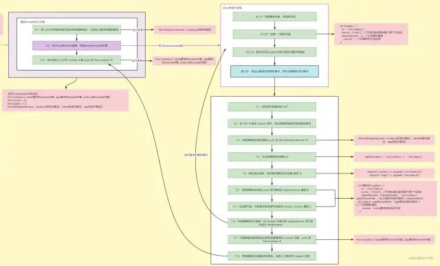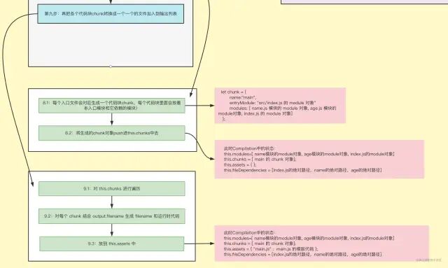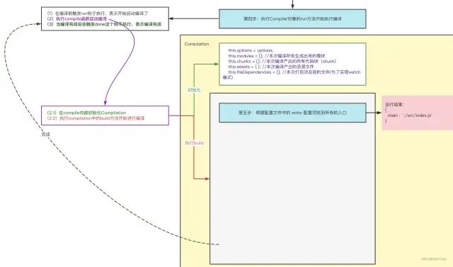 class Compilation { constructor(webpackOptions) { this.options = webpackOptions; this.modules = []; //本次编译所有生成出来的模块 this.chunks = []; //本次编译产出的所有代码块,入口模块和依赖的模块打包在一起为代码块 this.assets = {}; //本次编译产出的资源文件 this.fileDependencies = []; //本次打包涉及到的文件,这里主要是为了实现watch模式下监听文件的变化,文件发生变化后会重新编译 } buildModule(name, modulePath) { //省略其他 } build(callback) { //第五步:根据配置文件中的`entry`配置项找到所有的入口 //省略其他 //第六步:从入口文件出发,调用配置的 `loader` 规则,对各模块进行编译 for (let entryName in entry) { //entry entryName就是entry的属性名,也将会成为代码块的名称 let entryFilePath = path.posix.join(baseDir, entry[entryName]); //path.posix为了解决不同操作系统的路径分隔符,这里拿到的就是入口文件的绝对路径 //6.1 把入口文件的绝对路径添加到依赖数组(`this.fileDependencies`)中,记录此次编译依赖的模块 this.fileDependencies.push(entryFilePath); //6.2 得到入口模块的的 `module` 对象 (里面放着该模块的路径、依赖模块、源代码等) let entryModule = this.buildModule(entryName, entryFilePath); //6.3 将生成的入口文件 `module` 对象 push 进 `this.modules` 中 this.modules.push(entryModule); //第八步:等所有模块都编译完成后,根据模块之间的依赖关系,组装代码块 `chunk`(一般来说,每个入口文件会对应一个代码块`chunk`,每个代码块`chunk`里面会放着本入口模块和它依赖的模块)+ let chunk = {+ name: entryName, //entry 代码块的名称+ entryModule, //此代码块对应的module的对象,这里就是src/index.js 的module对象+ modules: this.modules.filter((item) => item.names.includes(entryName)), //找出属于该代码块的模块+ };+ this.chunks.push(chunk); } //编译成功执行callback callback() }}运行流程图(点击可放大):
