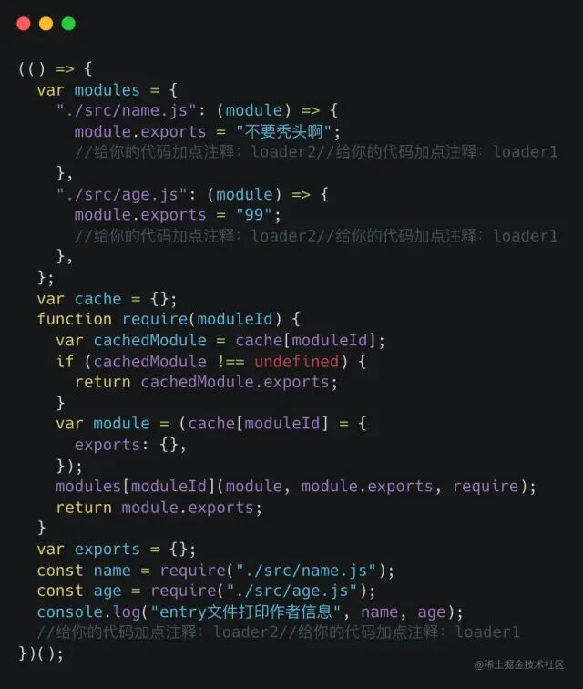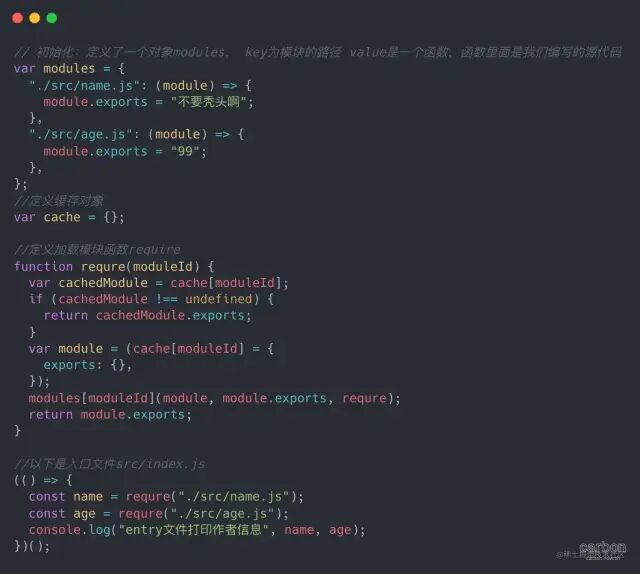 路径、源代码、它所依赖的模块等:var modules = [{ id: "./src/name.js",//路径 dependencies: [], //所依赖的模块 source: 'module.exports = "不要秃头啊";', //源代码},{ id: "./src/age.js", dependencies: [], source: 'module.exports = "99";',},{ id: "./src/index.js", dependencies: ["./src/name.js", "./src/age.js"], source: 'const name = require("./src/name.js");\n' + 'const age = require("./src/age.js");\n' + 'console.log("entry文件打印作者信息", name, age);',},];第三步:根据上一步得到的信息,生成最终输出到硬盘中的文件(dist):包括 modules 对象、require 模版代码、入口执行文件等