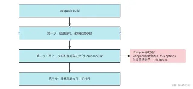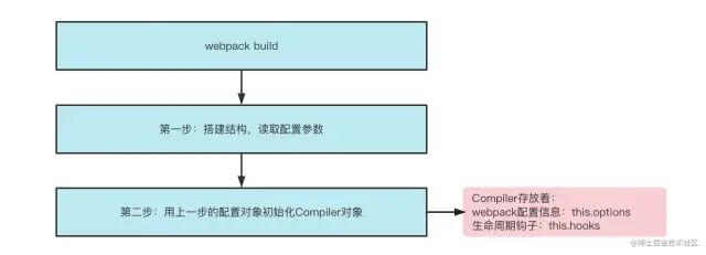 //Compiler其实是一个类,它是整个编译过程的大管家,而且是单例模式class Compiler {+ constructor(webpackOptions) {+ this.options = webpackOptions; //存储配置信息+ //它内部提供了很多钩子+ this.hooks = {+ run: new SyncHook(), //会在编译刚开始的时候触发此run钩子+ done: new SyncHook(), //会在编译结束的时候触发此done钩子+ };+ }}//第一步:搭建结构,读取配置参数,这里接受的是webpack.config.js中的参数function webpack(webpackOptions) { //第二步:用配置参数对象初始化 `Compiler` 对象+ const compiler = new Compiler(webpackOptions) return compiler;}运行流程图: