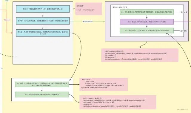 class Compilation { constructor(webpackOptions) { this.options = webpackOptions; this.modules = []; //本次编译所有生成出来的模块 this.chunks = []; //本次编译产出的所有代码块,入口模块和依赖的模块打包在一起为代码块 this.assets = {}; //本次编译产出的资源文件 this.fileDependencies = []; //本次打包涉及到的文件,这里主要是为了实现watch模式下监听文件的变化,文件发生变化后会重新编译 } buildModule(name, modulePath) { //省略其他 } build(callback) { //第五步:根据配置文件中的`entry`配置项找到所有的入口 //省略其他 //第六步:从入口文件出发,调用配置的 `loader` 规则,对各模块进行编译 for (let entryName in entry) { //entry entryName就是entry的属性名,也将会成为代码块的名称 let entryFilePath = path.posix.join(baseDir, entry[entryName]); //path.posix为了解决不同操作系统的路径分隔符,这里拿到的就是入口文件的绝对路径 //6.1 把入口文件的绝对路径添加到依赖数组(`this.fileDependencies`)中,记录此次编译依赖的模块 this.fileDependencies.push(entryFilePath); //6.2 得到入口模块的的 `module` 对象 (里面放着该模块的路径、依赖模块、源代码等) let entryModule = this.buildModule(entryName, entryFilePath);+ //6.3 将生成的入口文件 `module` 对象 push 进 `this.modules` 中+ this.modules.push(entryModule); } //编译成功执行callback callback() }}运行流程图(点击可放大):