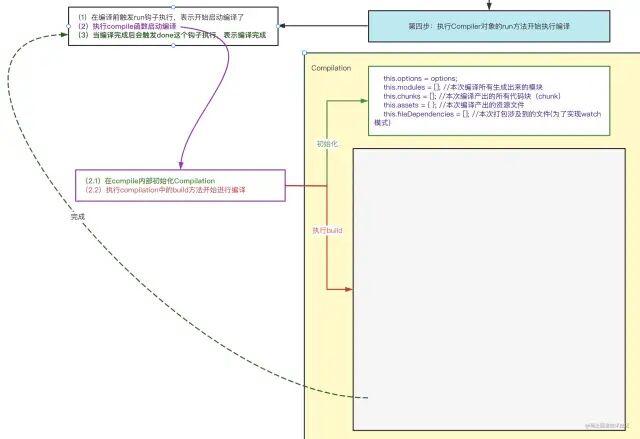 class Compiler { //省略其他 run(callback) { //省略 } compile(callback) { //虽然webpack只有一个Compiler,但是每次编译都会产出一个新的Compilation, //这里主要是为了考虑到watch模式,它会在启动时先编译一次,然后监听文件变化,如果发生变化会重新开始编译 //每次编译都会产出一个新的Compilation,代表每次的编译结果+ let compilation = new Compilation(this.options);+ compilation.build(callback); //执行compilation的build方法进行编译,编译成功之后执行回调 }}+ class Compilation {+ constructor(webpackOptions) {+ this.options = webpackOptions;+ this.modules = []; //本次编译所有生成出来的模块+ this.chunks = []; //本次编译产出的所有代码块,入口模块和依赖的模块打包在一起为代码块+ this.assets = {}; //本次编译产出的资源文件+ this.fileDependencies = []; //本次打包涉及到的文件,这里主要是为了实现watch模式下监听文件的变化,文件发生变化后会重新编译+ }+ build(callback) {+ //这里开始做编译工作,编译成功执行callback+ callback()+ }+ }运行流程图(点击可放大):