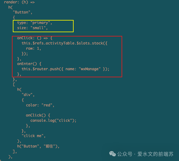 render 语法中,黄色是对 props 的处理,红色是对事件绑定的处理