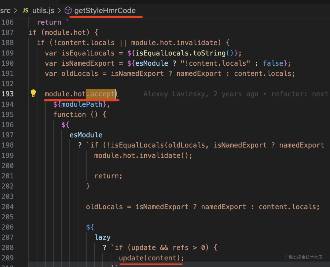 style-loader 会在产物里注入 hmr 代码,定义 module.hot.accept 方法,如果收到更新之后,会调用 update。