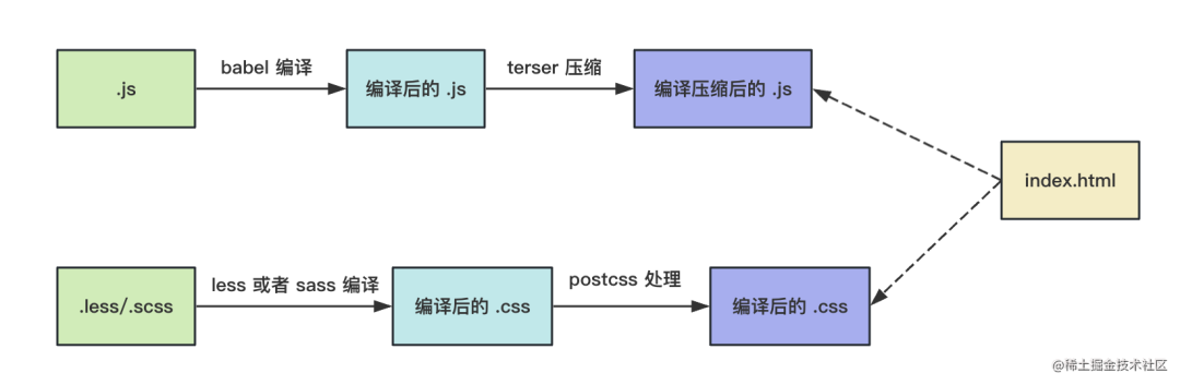 比如 js 用 babel 编译,再用 terser 压缩、css 用 sass 或者 less 编译,再用 postcss 做添加兼容性前缀等处理: