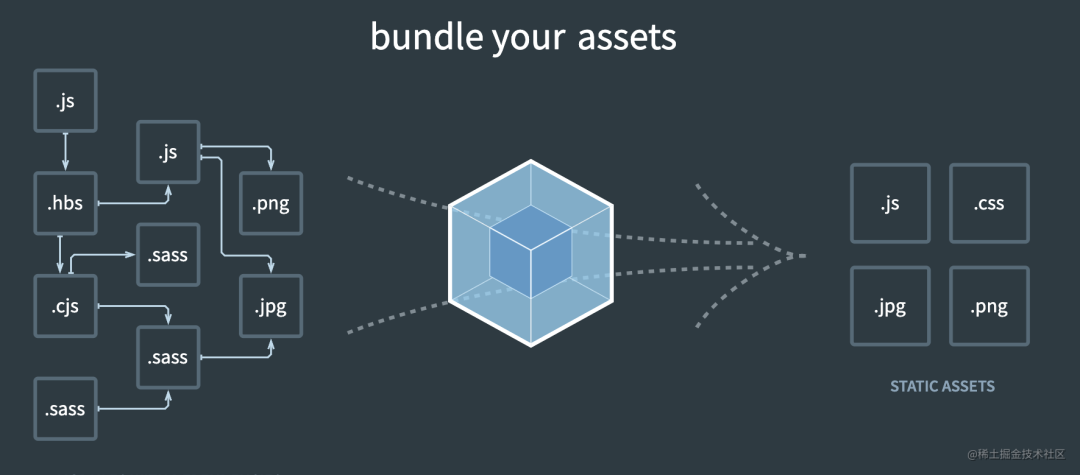 后来 webpack 就出现了,它的核心就是把所有 web 资源一起打包: