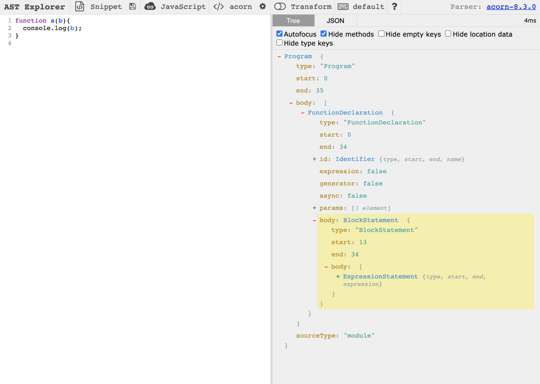 想看看你的代码会生成怎样的抽象语法树吗?这里有一个工具 AST Explorer 能够在线预览你的代码生成的抽象语法树,感兴趣的不妨上去试一试。