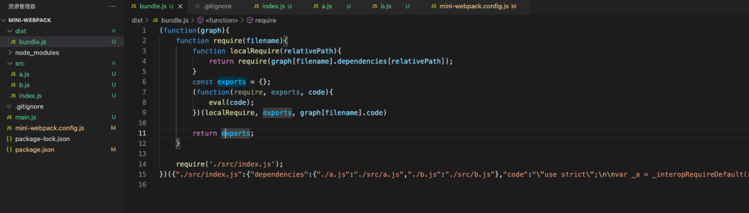 生成依赖图谱对象,作为参数传入一个自执行函数当中。可以看到,自执行函数中有个 require 函数,它的作用是通过调用 eval 执行模块代码来获取模块内部 export 出来的值。最终我们返回打包的代码。