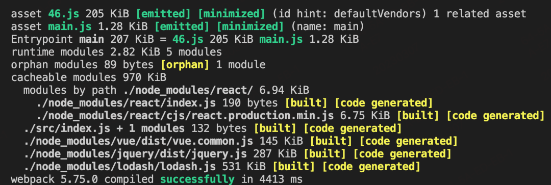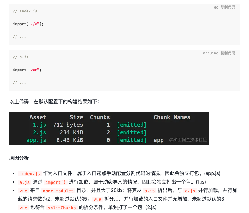 // index.jsimport "./a";console.log("this is index");// a.jsimport "vue";import "react";import "jquery";import "lodash";console.log("this is a");// webpack.config.jsconst path = require('path');module.exports = { mode: "production", entry: './src/index.js', output: { filename: '[name].js', path: path.resolve(__dirname, 'dist'), }, optimization: { splitChunks: { chunks: 'all', }, },};编译结果: