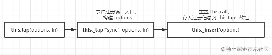hook.tap('event-1', (contry, city, people) => { console.log('event-1:', contry, city, people)})hook.tap 的执行流程大致如下: