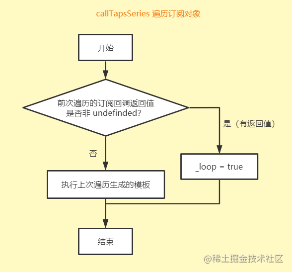 var _loop;do { _loop = false; ${ callTapsSeries 生成的模板 }} while(_loop)这里的后续逻辑很好猜测:callTapsSeries 生成的模板,只需要判断订阅回调返回值是否为 undefined,然后修改 _loop 即可。