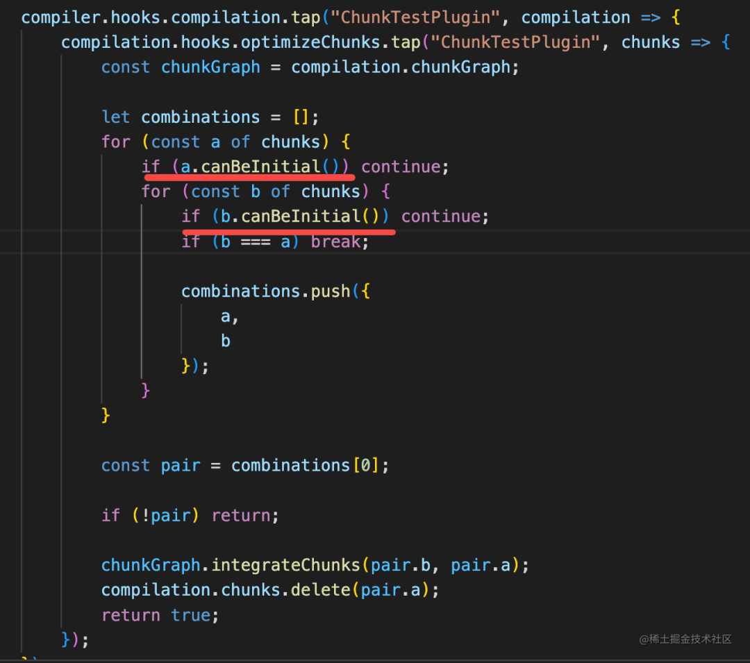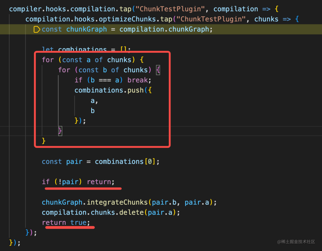 class ChunkTestPlugin { constructor(options) { this.options = options || {}; } apply(compiler) { const options = this.options; const minSizeReduce = options.minSizeReduce || 1.5; compiler.hooks.compilation.tap("ChunkTestPlugin", compilation => { compilation.hooks.optimizeChunks.tap("ChunkTestPlugin", chunks => { const chunkGraph = compilation.chunkGraph; let combinations = []; for (const a of chunks) { if (a.canBeInitial()) continue; for (const b of chunks) { if (b.canBeInitial()) continue; if (b === a) break; const aSize = chunkGraph.getChunkSize(b, { chunkOverhead: 0 }); const bSize = chunkGraph.getChunkSize(a, { chunkOverhead: 0 }); const abSize = chunkGraph.getIntegratedChunksSize(b, a, { chunkOverhead: 0 }); const improvement = (aSize + bSize) / abSize; combinations.push({ a, b, improvement }); } } combinations.sort((a, b) => { return b.improvement - a.improvement; }); const pair = combinations[0]; if (!pair) return; if (pair.improvement < minSizeReduce) return; chunkGraph.integrateChunks(pair.b, pair.a); compilation.chunks.delete(pair.a); return true; }); }); }}module.exports = ChunkTestPlugin;总结