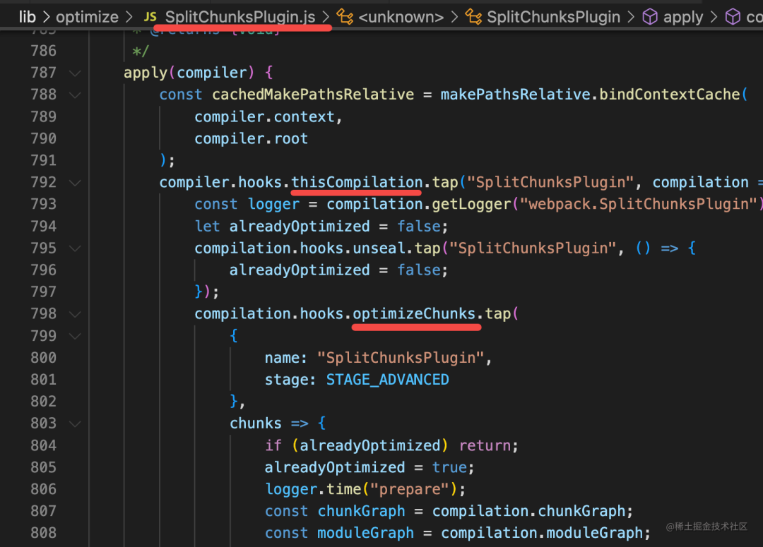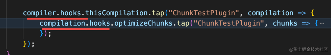 首先在 compiler 的 thisCompilation 的 hook 里来注册 compilation 的 optimizeChunks 的 hook。