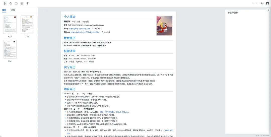 我是有个基于DOM实现的简历编辑器项目的,因为暂时找不到可以用Canvas实现的比较有意思的场景,所以才选择了继续做简历编辑器,最开始做简历编辑器就是因为很多简历网站都是要开会员的,要不就是简历的自定义程度比较差,达不到我想要的效果,在学校的某一个晚上突发奇想于是自己做了一个出来。