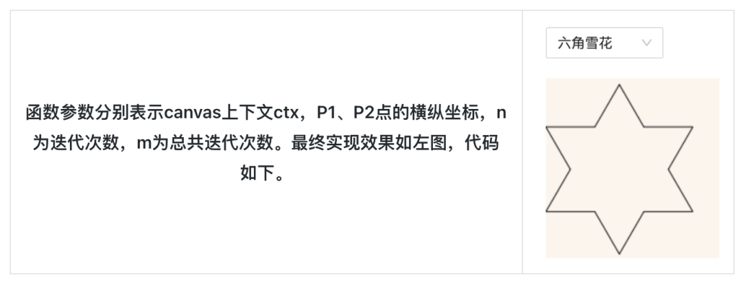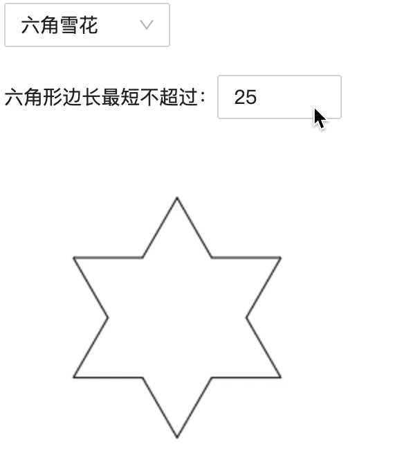 // 向量旋转 vmiddle.rotate((60 * Math.PI) / 180).add(vstart); vend = vmiddle.copy().sub(vstart); vend.rotate((-120 * Math.PI) / 180).add(vmiddle); const thirdv = vend .copy() .sub(vmiddle) .scale(1 / 3) .add(vmiddle); const newHexagonLen = thirdv.copy().sub(vmiddle).vlength; if (newHexagonLen > minLine) { // 递归 hexagon(ctx, vmiddle, thirdv); } else { // 绘图 ctx.beginPath(); ctx.moveTo(...vstart); ctx.lineTo(...vmiddle); ctx.lineTo(...vend); ctx.stroke(); } vstart = vend.copy(); vmiddle = vend.copy().sub(vmiddle);这样,我们就实现了绘制六角雪花的方法。