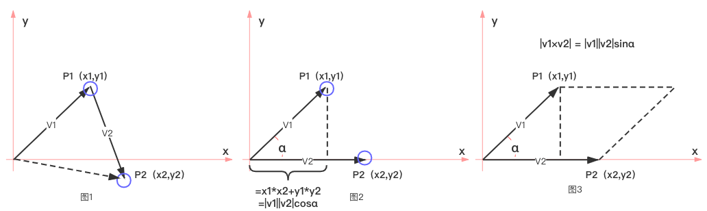 向量相加 / 减。向量点乘、叉乘。如图 1 所示,向量相加的含义是,路径沿 v1、v2 进行绘画,则 P2 坐标点为 v1 与 v2 两个向量相加,为 [x1+x2, y1+y2]。点乘为 a、b 向量点积的几何含义,是 a 向量乘以 b 向量在 a 向量上的投影分量,如图 2 所示。叉乘为两向量组成的面积,如图 3 所示。