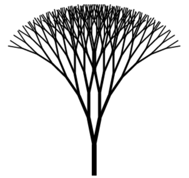 在递归模块中,我们将树枝长度与宽度都削减为上一级树枝的 1/2。并且进行固定角度的左右偏移。终止条件为树枝的长度小于规定好的最小长度。这样就可以画出一颗二叉树了。