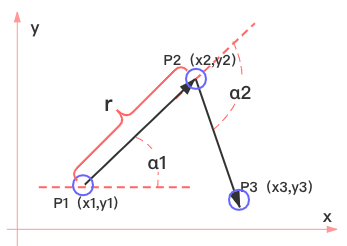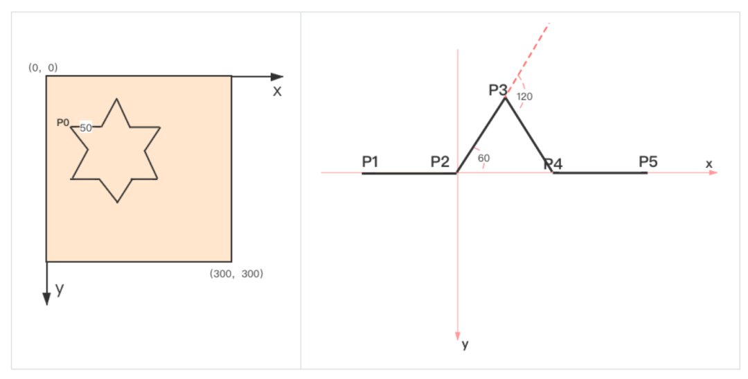 假设路径是从 P1 点画到 P2,再到 P3、P4。已知 P1、P2 的坐标,那么我们还需要找到 P3、P4 的坐标是多少。这是一个简单的根据坐标与角度找下一个坐标的数学问题,我们可以通过简单的顶点换算将其绘制出来。