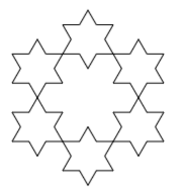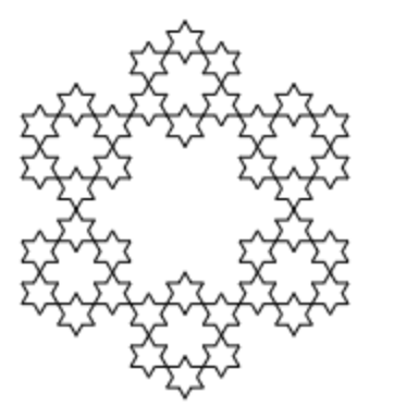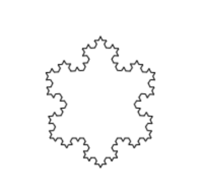 先看一下实现效果,它的基础图形是六角形。每迭代一次,都以每条线段的 1/3 作为边长,在每个角顶点处再画出下一个小六角形。重复这个步骤便可以得到一个六角形雪花分型图。