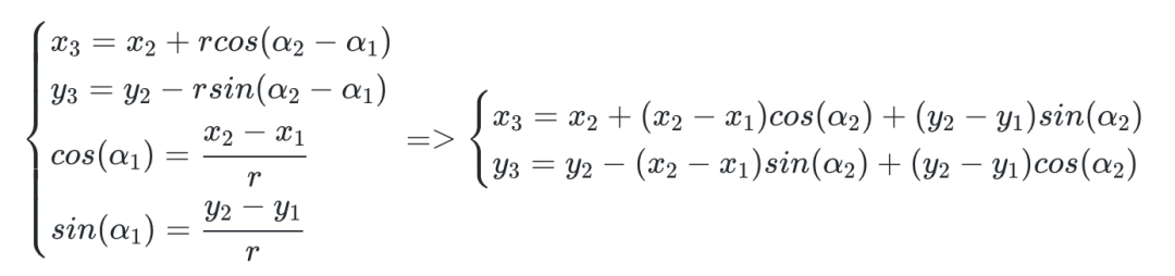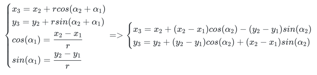 先简单复习一下数学知识。已知 P1、P2 的坐标,P2P1 的长度为 r,将向量 P1P2 顺时针旋转 α2 角度后,计算 P3 的坐标值。同理可以得到逆时针旋转的计算公式。由以上推导同样可以得到旋转矩阵如下。