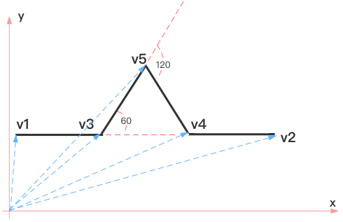 const v3 = new Vector(100, 0).rotate((60 * Math.PI) / 180).add(v1);接着我们根据对三条边,也就是 v1v2、v2v3、v3v2 三向量分别进行递归操作。