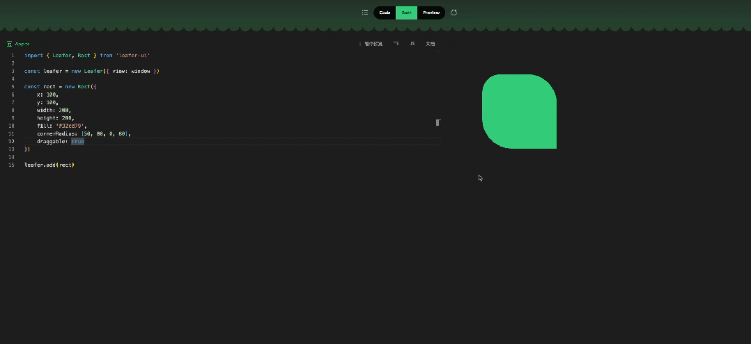 # 1. 创建项目npm create leafer@latest my-canvascd my-canvasnpm inpm run dev// 2. 写代码(index.ts)import { Leafer, Rect } from'leafer-ui'const leafer = new Leafer({ view: window })const rect = new Rect({ x: 100, y: 100, width: 200, height: 200, fill: '#32cd79', cornerRadius: [50, 80, 0, 80], draggable: true})leafer.add(rect)浏览器访问 http://localhost:5173——圆角矩形已可拖拽!