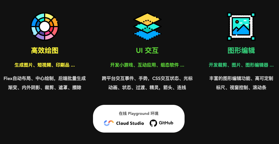 Flex布局,支持中心绘制,后端可批量生成图片。渐变、内外阴影、裁剪、遮罩、擦除:支持线性渐变、径向渐变、内外阴影、裁剪、遮罩、擦除等高级绘图功能。
