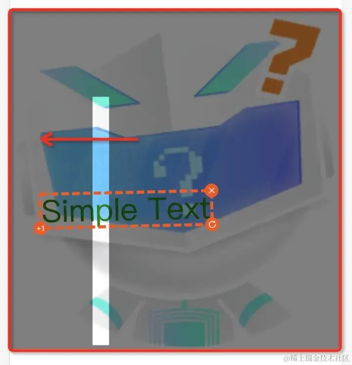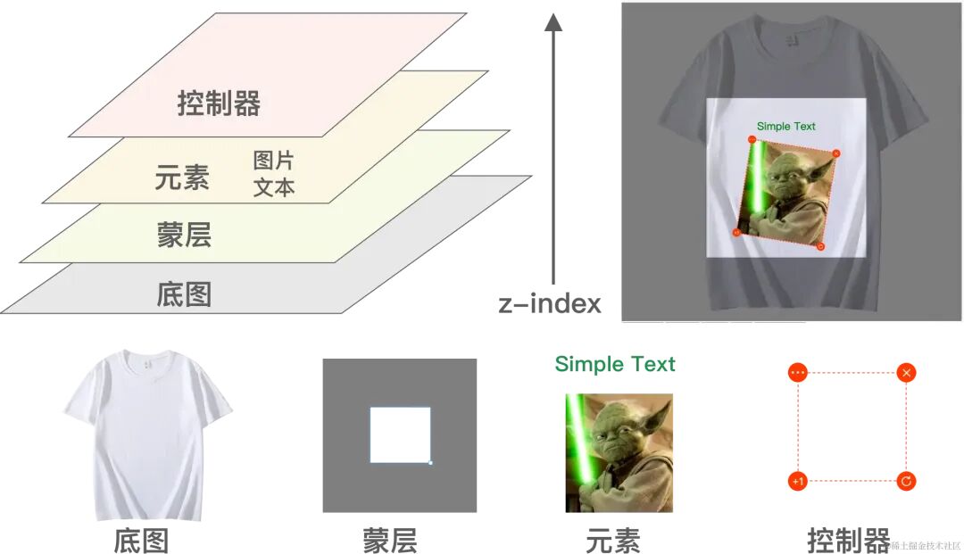 在这种模式下,原来控制器位于蒙层之上的效果也容易实现了。如下图所示,画布上从下到上分别是:底图,文本 / 图片元素,蒙层,控制器。