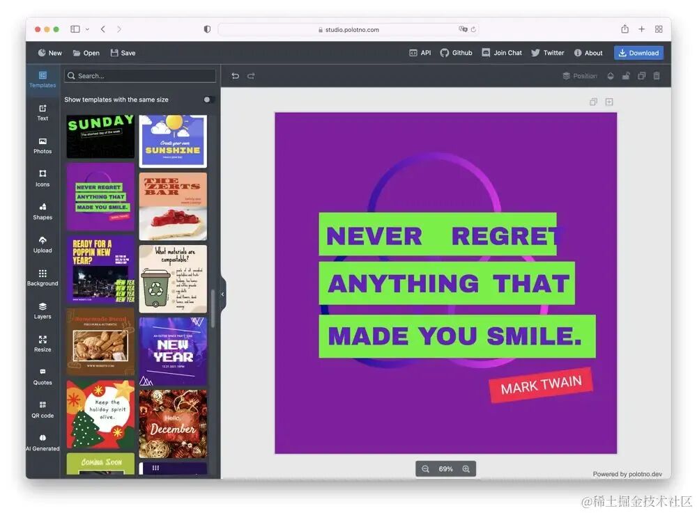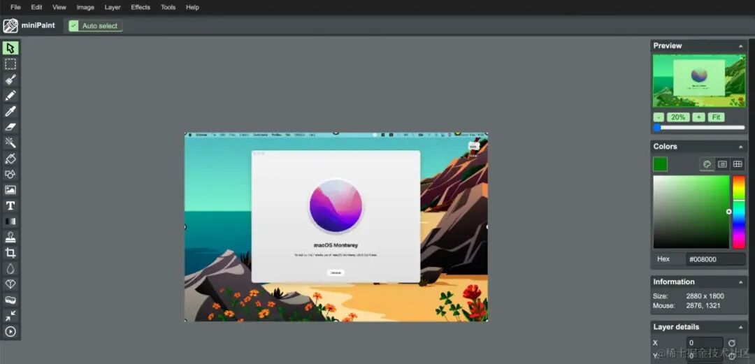 在 Web 上的编辑器种类也非常丰富,毕竟 canvas 能做的事情非常多。比如 miniPaint 基本复刻了 ps,基于 farbic.js 的 Pintura. 和 tui.image-editor,基于 Konva 的 polotno 等等。这些编辑器也基本是个 app 级别的应用了。