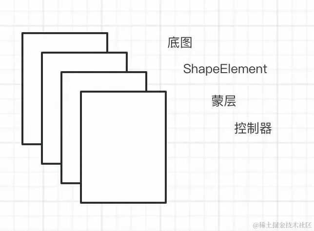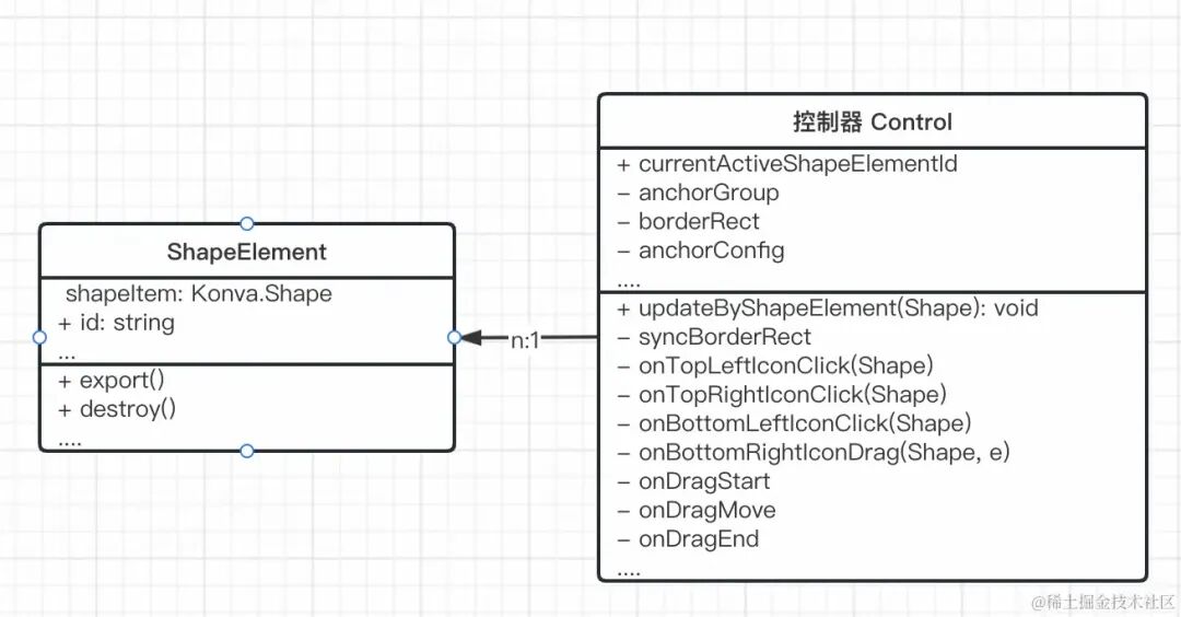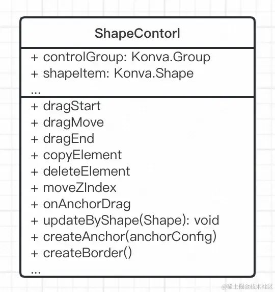 后面梳理后发现并不需要多个控制器实例子,同一时刻处于激活状态的元素只有一个,不会同时编辑(拖拽,缩放)两个元素。使用一个控制器实例,能够减少画布上的 Shape,便于控制元素的层级。后续的代码逐步演变成下图所示。