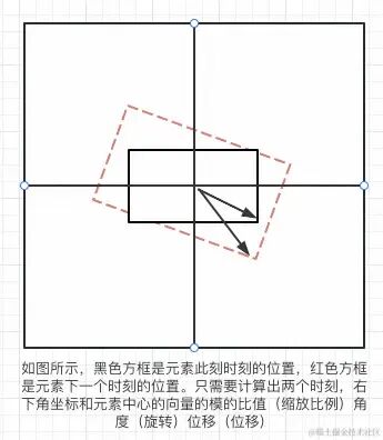 这里我们只需要在拖拽过程中计算出此刻 ”右下角 “和元素中心构成的向量 和 上个时刻” 右下角“ 和元素中心构成的向量,之间的比值,角度,和位移。然后再将这三中变换应用到元素上即可,如下图所示,具体的代码这里不再讲解。