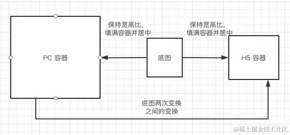 但本质上也是三个坐标系之间的转换问题。第一个坐标系是 PC 端底图的容器,第二个坐标系是图片底图本身,第三个坐标系是 h5 端底图的容器。底图填充容器的逻辑为:保持宽高比,填满容器的宽或高,另一个方向上居中处理。