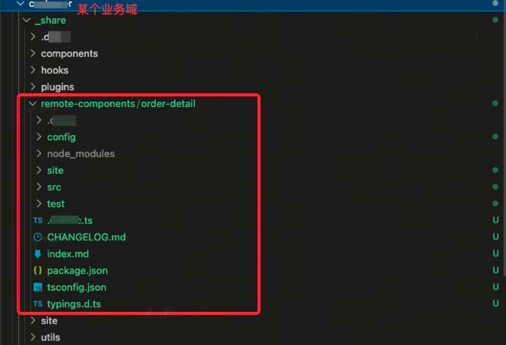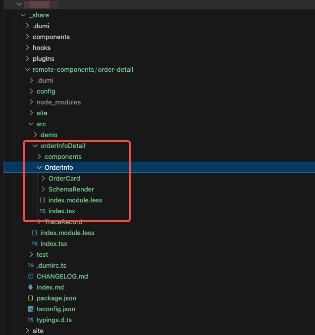 cd remote-components && dx cc order-detail同样是 Monorepo,大仓组件的创建方式和 Lerna 新建物料组件类似。借助脚手架根据填写的内容就能生成模版,可以编写单测去自测组件变更,能一定程度的保证组件的健壮性,避免出现破坏性升级的问题。生成之后的模板目录结构如下图。