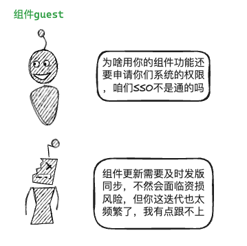 使用者需要关心页面权限,并及时配置,**组件提供方要感知是哪个系统在用组件,并把 Request 配置及时修改,不然就走到组件主系统的权限里去了。**总结一句就是所有工作量都来到了组件维护者这边,不过不用担心,掌握上面说到的几点原理就能游刃有余地处理权限问题。
