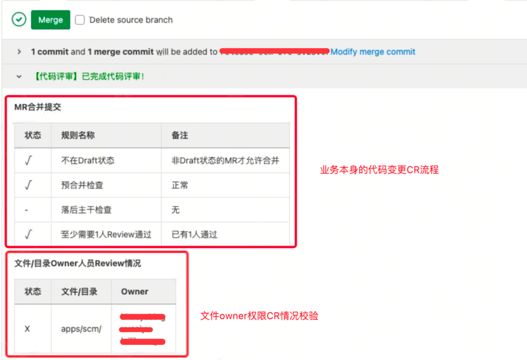**这里会带来一个问题:**当 Release 分支回合 Master 代码的时候,会创建临时 MR,这个过程也会有文件 Owner 权限的校验(比如客服同学同步代码的时候,也会将商家和供应链的代码一起同步过来),就需要其他业务域的文件 Owner CR 通过才行,但 Master 的代码实际已经是 CR 过的,没有必要重复 CR,并且同步频繁的时候,会经常 CR 确认,导致回合代码的效率非常低。这里给效率技术那边提了需求,在 Release 分支回合 Master 代码的时候,不做文件 Owner 的校验。