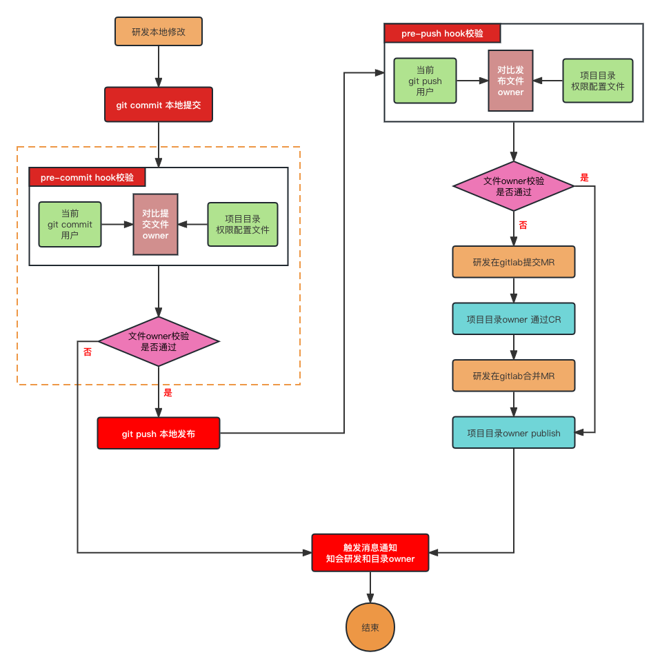 通过 Git Hooks 提供的 Pre-Commit 和 Pre-Push 两个节点做权限校验,防止出错。Pre-Commit 不是必须的,如果影响代码提交的效率,可以跳过这个步骤,Pre-Push 是必须的,不允许非 Owner 做本地发布。