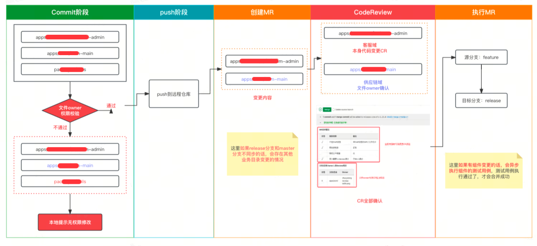 通过保护分支的约束以及钩子函数对部分核心文件的校验,减少了很多在 MR&CodeReview 中本该遇到的问题。**基于文件 Owner 权限的 MR 和 CodeReview 流程:**Commit 阶段 -> Push 阶段 -> 创建 MR -> CodeReview -> 执行 MR,每个阶段的流程如下: