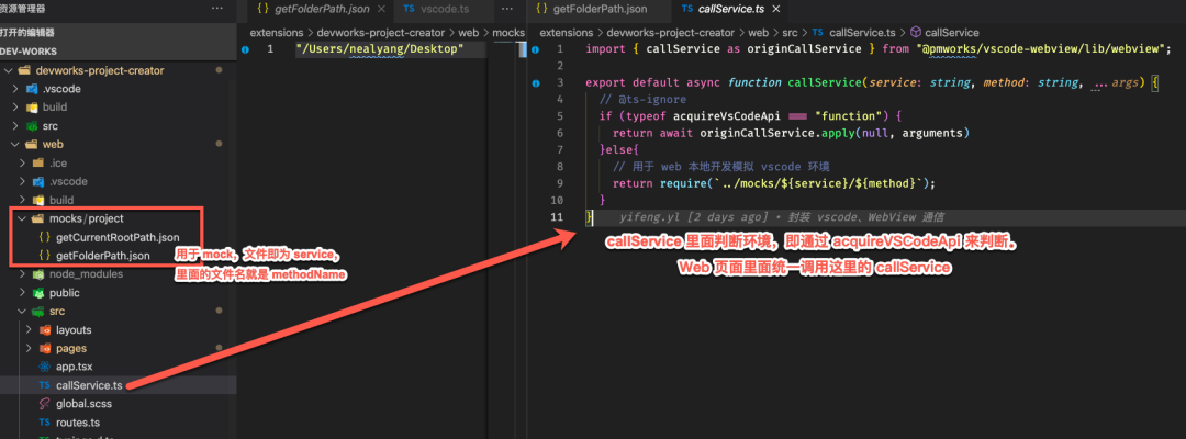 // packages/vscode-webview/webview.ts// @ts-ignoreexport const vscode = typeof acquireVsCodeApi === 'function' ? acquireVsCodeApi() : null;export const callService = function (service: string, method: string, ...args) { // 统一 return promise,统一调用方式 return new Promise((resolve, reject) => { // 生成对应的 eventId const eventId = setTimeout(() => { }); console.log(`WebView call vscode extension service:${service} ${method} ${eventId} ${args}`); // 收到 vscode 发来消息,一般为处理后 webView 的需求后 const handler = event => { const msg = event.data; console.log(`webview receive vscode message:}`, msg); if (msg.eventId === eventId) {// 去定时对应的 eventID,说明此次通信结束,可以移除(结束)此次通信了 window.removeEventListener('message', handler); msg.errorMessage ? reject(new Error(msg.errorMessage)) : resolve(msg.result); } } // webview 接受 vscode 发来的消息 window.addEventListener('message', handler); // WebView 向 vscode 发送消息 vscode.postMessage({ service, method, eventId, args }); });}webview 层完成了对发送时间请求、接受时间请求以及接受后取消完成(removeListener)此次时间请求的封装。那么我们在来给 extension 添加上对应的webView 需要的 service.methodName 才行。