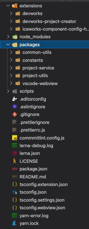 extensions 文件夹为 vscode 插件的文件夹、packages 文件夹是存放公共的组件、scripts 为发布、构建、开发的脚本,其他就是一些工程配置。