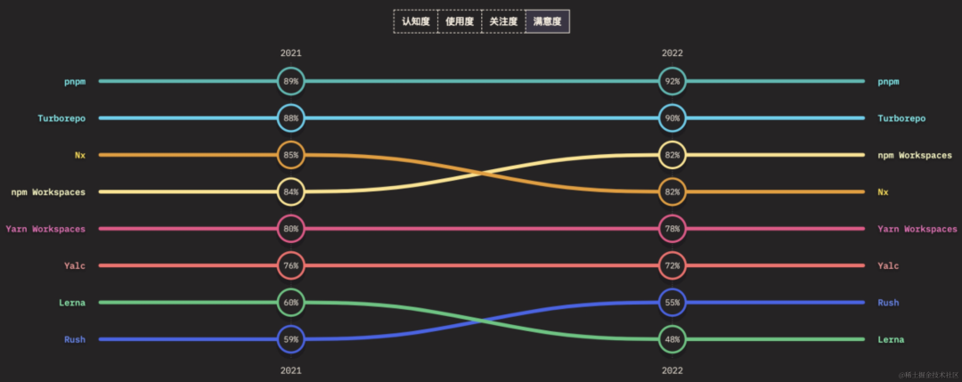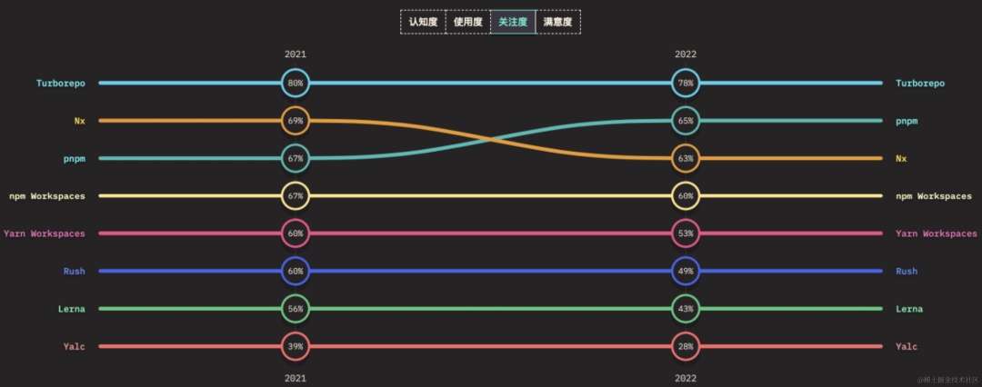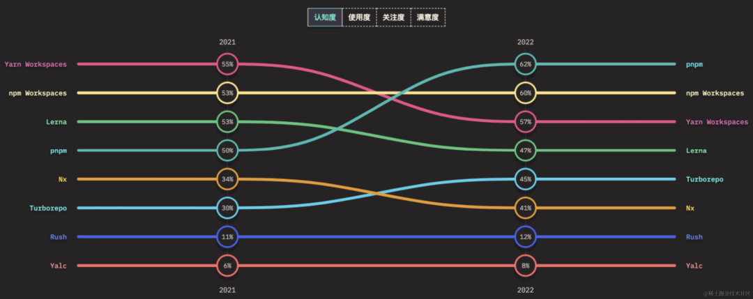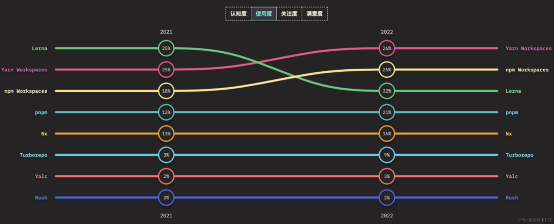 下面将从 Monorepo 工具的认知度、使用度、关注度和满意度四个方面进行简要分析: