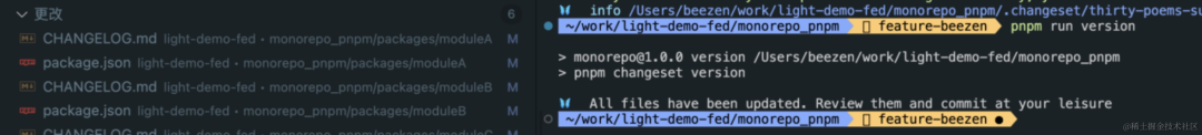 接着,管理者需要定期对项目提交内容进行合并。执行 changeset version 命令后,我们可以查看在这段时间内所有的提交信息,并对其中不合适的地方进行适度修改。一旦完成这一步操作,即表示已经处理了近期的所有开发提交文件。以下是操作的示例: