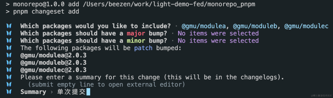 首先,开发者完成每次的代码提交之后,只需要执行 changeset add 命令,以记录每次提交的版本变更信息,操作如下: