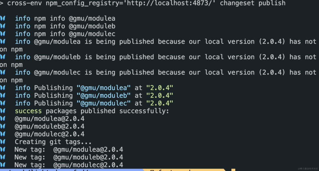 最后,管理者只需要执行 changeset publish 命令,就可以为所有模块分别打上 tag 日志,并自动发布到镜像源,操作示例如下: