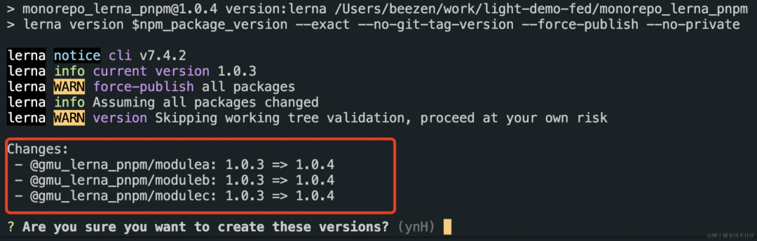 首先执行 lerna version 命令时,会询问是否需要将版本号统一修改为某一个版本,确认后则会自动修改,非常简单。示例如下: