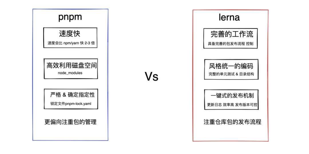 pnpm 更注重包的管理(像下载,稳定准确性等),相比之下 Lerna 更注重包的发布流程规范指定。