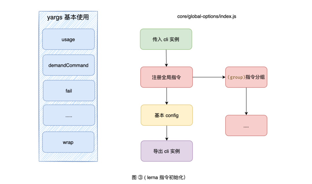 const dedent = require("dedent"); // 去除空行const log = require("npmlog");const yargs = require("yargs/yargs");const { globalOptions } = require("@lerna/global-options");module.exports = lernaCLI;function lernaCLI(argv, cwd) { const cli = yargs(argv, cwd); return globalOptions(cli) .usage("Usage: $0 <command> [options]") .demandCommand(1, "A command is required. Pass --help to see all available commands and options.") // 期望命令个数 .recommendCommands() // 推荐命令 .strict() // 严格模式 .fail((msg, err) => { // ... 省略 }) .alias("h", "help") // 别名 .alias("v", "version") .wrap(cli.terminalWidth()) // 宽高 .epilogue(dedent` When a command fails, all logs are written to lerna-debug.log in the current working directory. For more information, find our manual at https://github.com/lerna/lerna `); // 结尾}查看图三全局指令初始化,我们会发现全局指令接受实例的传入,也支持指令的注册。显然这也导出了改 cli 实例(单一实例)